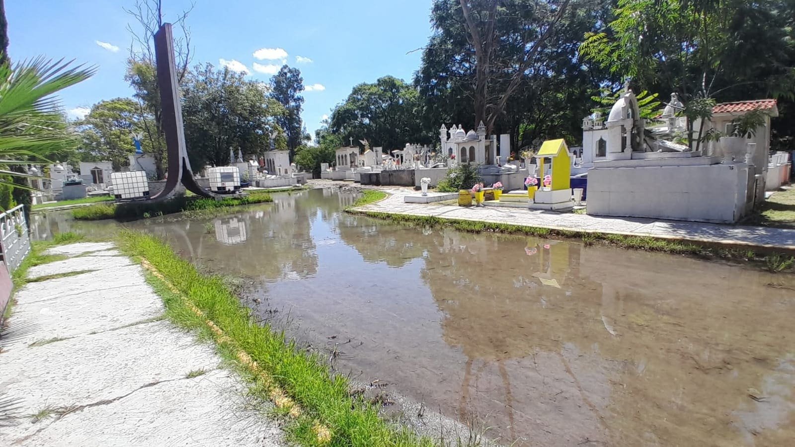 En el acceso principal del cementerio se forma un gran encharcamiento de agua que no solo dificulta el paso, sino que también se ha convertido en un foco de contaminación. En su interior se puede observar fauna acuática, basura, ladrillos y objetos inusuales como una toalla de baño.