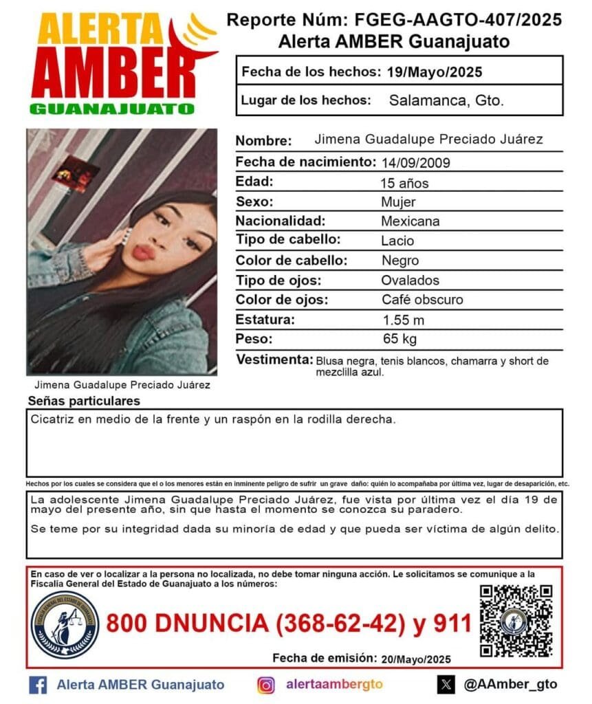 Activación de la Alerta AMBER Guanajuato de la adolescente Jimena Guadalupe Preciado Juárez de 15 años, Salamanca, Gto. ¡Ayúdanos a localizarla!.