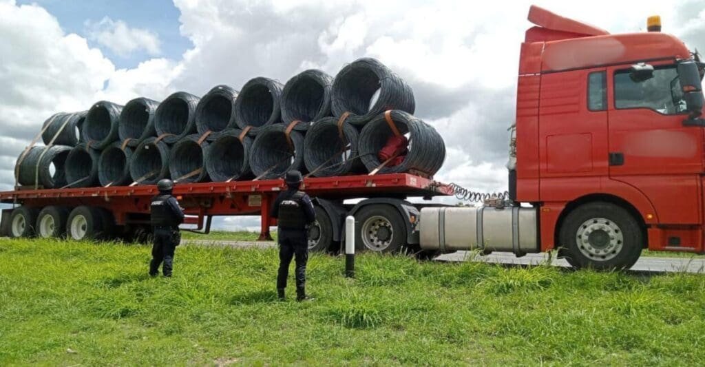 Durante la maniobra evasiva, el operador trató de impactar la unidad policial. Los integrantes de las FSPE lograron detener el vehículo y confirmar que transportaba 18 rollos de alambrón, con un peso aproximado de 32 toneladas y un valor de 1.9 millones de pesos, sin que el conductor pudiera acreditar su legal posesión ni presentar documentación del acoplado.