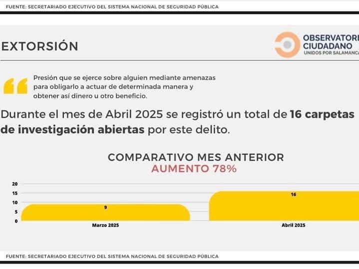 Salamanca, Gto.- El Observatorio Ciudadano Unidos por Salamanca dieron a conocer un preocupante aumento en los casos de extorsión registrados en la ciudad durante el mes de abril de 2025. Según datos del Secretariado Ejecutivo del Sistema Nacional de Seguridad Pública, se abrieron un total de 16 carpetas de investigación por este delito, lo que representa un incremento del 78% en comparación con marzo, mes en el que se documentaron 9 casos.