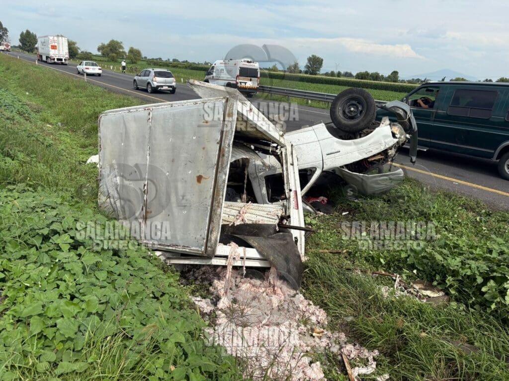 Salamanca, Gto.– Un accidente vehicular provocó intensa movilización la tarde de este martes  sobre la autopista Salamanca–Querétaro, a la altura del kilómetro 76, luego de que una camioneta que transportaba vísceras volcara aparatosamente.