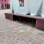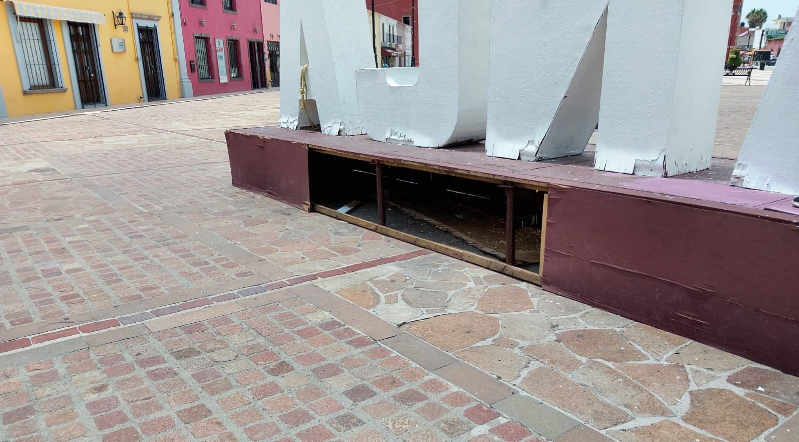 La madera poco a poco va cayendo, la pintura se combina con fibras del material y existen perforaciones en la base que sostiene el nombre de este territorio del Bajío.