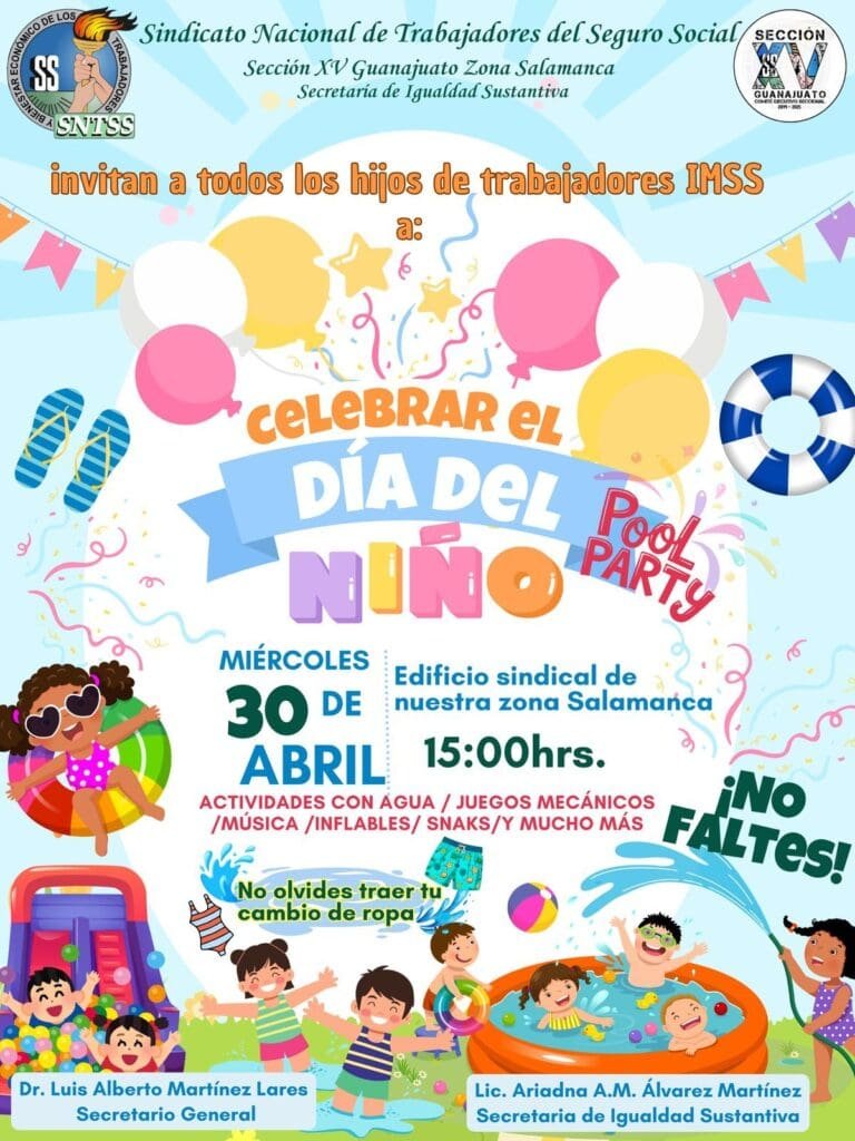 Salamanca, Gto.- El Sindicato Nacional de Trabajadores del Seguro Social (SNTSS), Sección XV Guanajuato Zona Salamanca, a través de su Secretaría de Igualdad Sustantiva, invita a todos los hijos de los trabajadores del Instituto Mexicano del Seguro Social (IMSS) a celebrar el Día del Niño en un evento lleno de diversión y actividades recreativas.