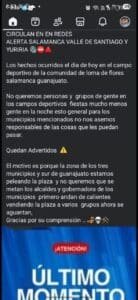 “Los hechos ocurridos el día de hoy en el campo deportivo de la comunidad de Loma de Flores, Salamanca, Guanajuato, no queremos personas y grupos de gente en los campos deportivos, fiestas, mucho menos gente en la noche. Esto es general para los municipios mencionados. No nos hacemos responsables de las cosas que les puedan pasar”, dice el mensaje.