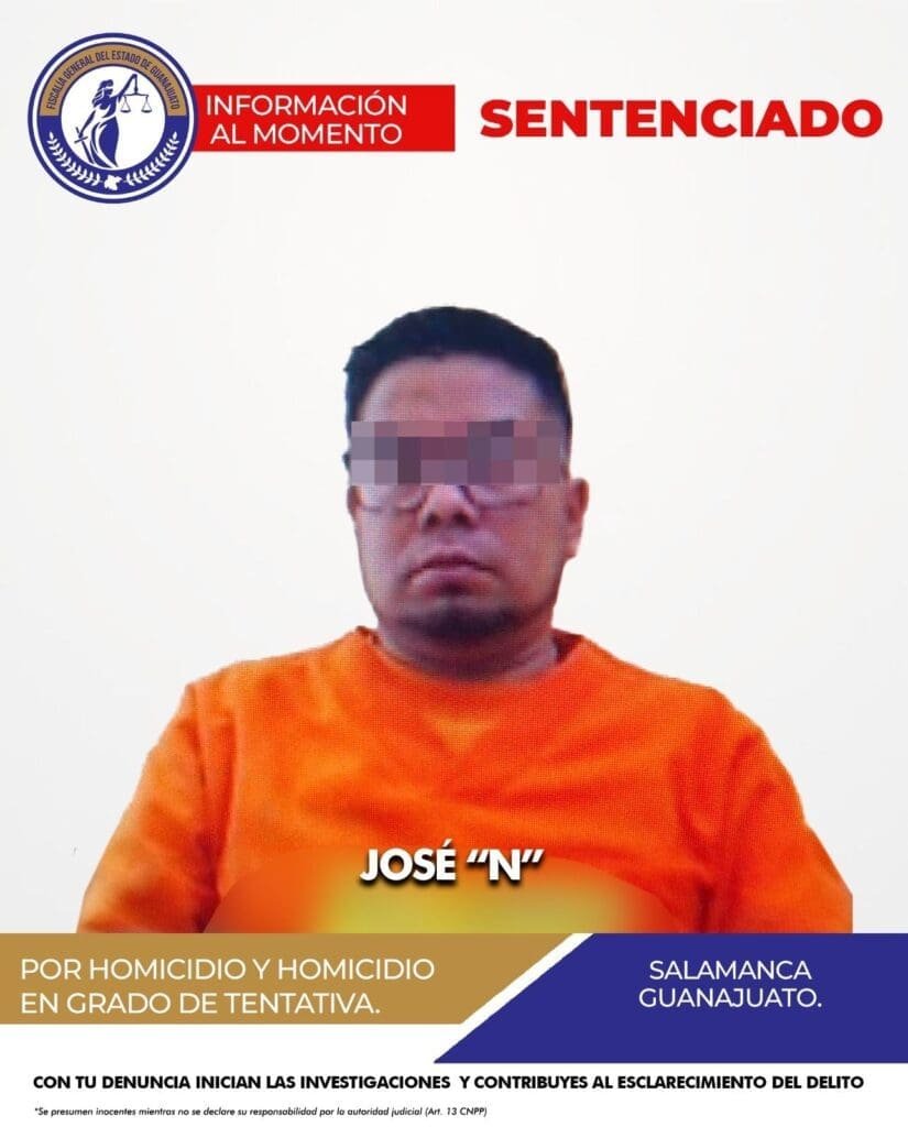 Salamanca, Gto. – En una sentencia dictada el 28 de marzo de 2025, un hombre identificado como José fue condenado a 42 años de prisión por homicidio calificado y tentativa de homicidio.