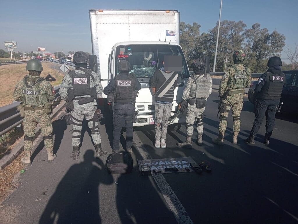 Durante la intervención fue detenido Antonio “N”, de 27 años, con domicilio en el fraccionamiento Las Carretas, quien se encontraba a bordo de un vehículo marca Isuzu. Tras una inspección preventiva, se le aseguró un arma de fuego calibre 9 milímetros, un dispositivo inhibidor de señal y el propio vehículo en el que circulaba.