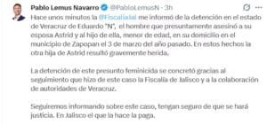 “La detención de este presunto feminicida se concretó gracias al seguimiento que hizo de este caso la Fiscalía de Jalisco y a la colaboración de autoridades de Veracruz”, instó el mandatario.