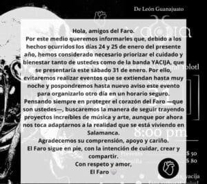 ” Pensando siempre en proteger el corazón del Faro [que son ustedes], buscaremos la manera de seguir trayendo proyectos increíbles de arte y música, aunque por ahora nos toque adaptarnos a la realidad que está viviendo Salamanca”, precisó el espacio creativo independiente.