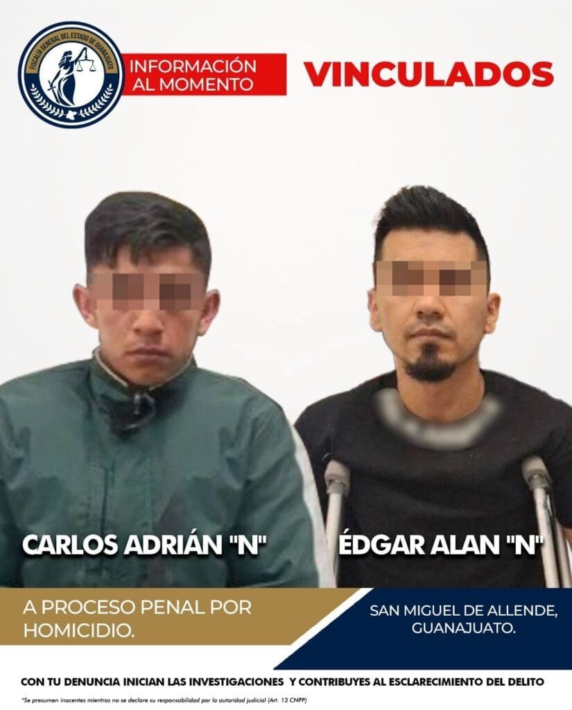 Agentes de Investigación de la Fiscalía General del Estado de Guanajuato cumplieron órdenes de aprehensión contra Carlos Adrián “N”, alias “El Maletas”, y Édgar Alan “N”, alias “El Cachorro”, presuntos responsables del delito de homicidio ocurrido en el interior de un bar en San Miguel de Allende.