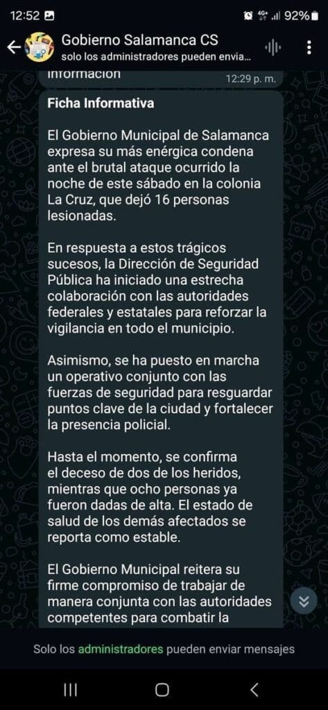 Después de varias horas y como es costumbre por parte de gobierno municipal informo a través de un comunicado que el saldo drl ataque armado fue 16 personas lesionados y dos personas sin vida, mientras quenla Fiscalia informo de 12 lesionados y dos muertos.