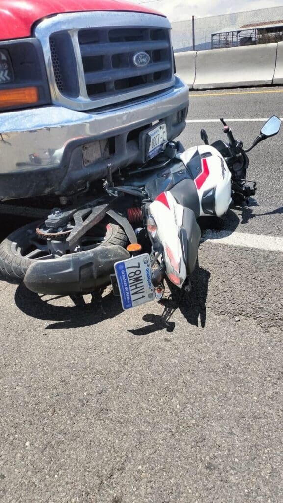 La motocicleta, con placas de Guanajuato, quedó atrapada bajo la parte frontal de una camioneta marca Ford de color rojo, lo que sugiere un fuerte impacto. Elementos de la Guardia Nacional División Carreteras y personal de tránsito municipal acudieron para acordonar la zona y realizar los peritajes correspondientes.