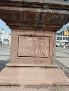 “Desde el río hasta el mar, ¡Palestina libre!”, es uno de los mensajes más recientes escritos en la estatua de busto de Miguel Hidalgo. A manera de iconoclasia, la consigna no es gratuita en este espacio, ya que la Plazoleta representa una carga importante en la historia Salamantina.