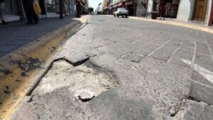 Salamanca, Gto.- La rehabilitación de la calle Juárez en el centro histórico continúa como uno de los pendiente s mientras avanza el deterioro del pórfido. Los automovilistas piden intervención de autoridades.