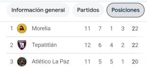 En tercer posición está el conjunto de Atlético La Paz quienes cuentan con 20 puntos, seguidos de Tapatío y Mineros ambos con 17 unidades aunque mejor diferencia de goles para los de Jalisco.