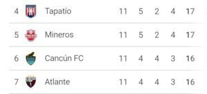 Curiosamente, en sexto y séptimo lugar marchan un equipo que tiene su sede actual en el estadio Andrés Quintana Roo de Cancún y otro equipo que tuvo como sede muchos años el mismo recinto, Cancún y Atlante, las dos escuadras con 16 puntos, aunque los Potros de Hierro viven su última etapa en la Liga Expansión ya que la próxima temporada participarán en la Primera División.