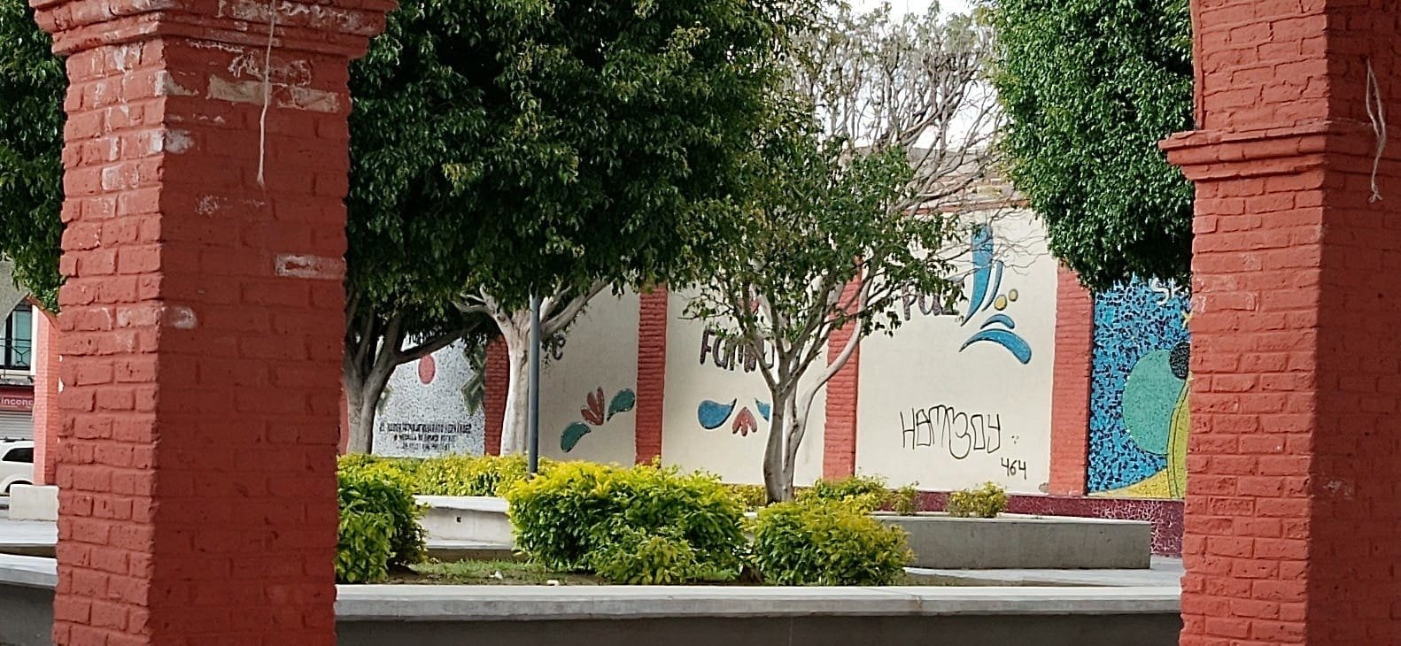 Entre hojas marchitas, pintas urbanas y jardineras roídas, el espacio rehabilitado en 2021 con técnica de azulejos, hoy presenta olvido