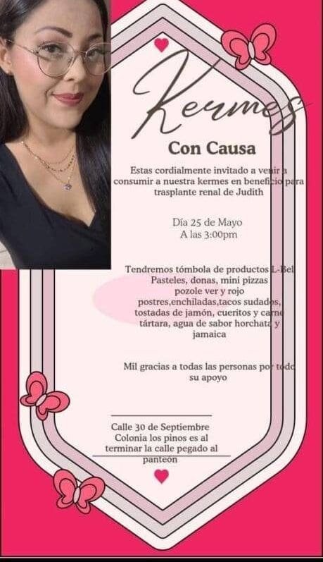 Este próximo 25 de mayo a las 3:00 p.m., se llevará a cabo una kermés con causa en beneficio de Judith, quien requiere de un trasplante renal. La comunidad está cordialmente invitada a participar y consumir los productos que se ofrecerán, con el propósito de reunir fondos para este importante tratamiento médico.