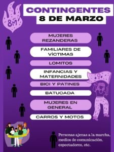 La marcha es pacífica y es articulada por los bloques de mujeres rezanderas, familiares de víctimas, lomitos, infancias y maternidades, bici y patines, batucada, mujeres en general y, por último, carros y motos.