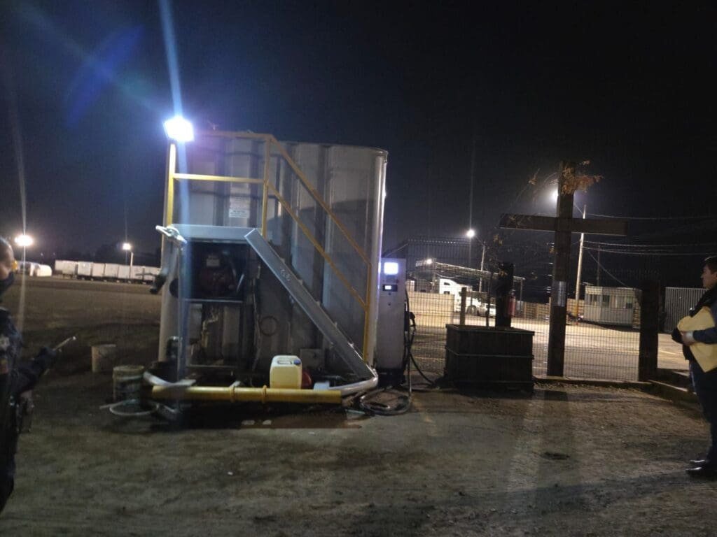 En el sitio se localizaron dos contenedores con capacidad total aproximada de 47 mil litros, una bomba despachadora tipo gasolinera sin la autorización legal correspondiente, siete tractocamiones y 92 cajas secas.