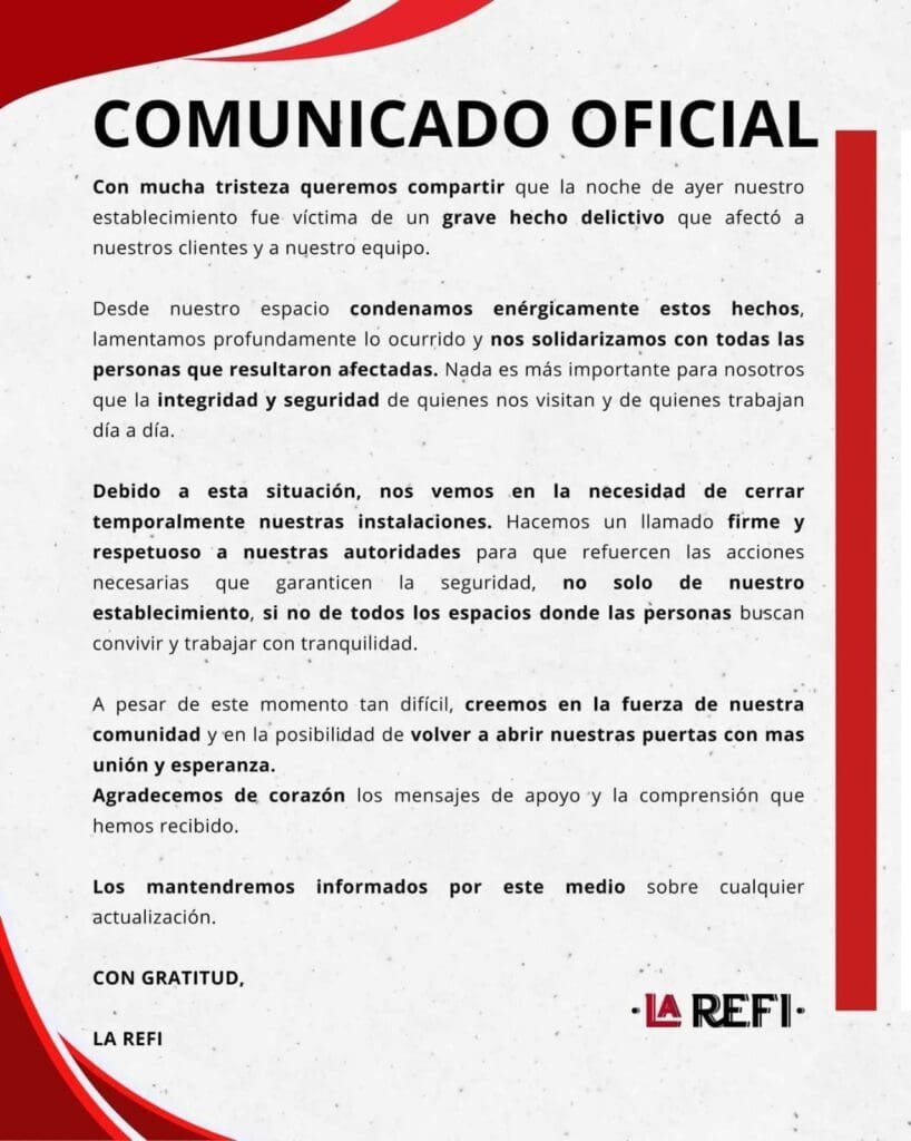 Por lo que ante su situación particular, el establecimiento realizó un llamado a las autoridades para que refuercen las acciones necesarias para garantizar la seguridad en la ciudad. “Es fundamental que se tomen medidas efectivas para proteger a los negocios y a la comunidad en general”, se externó en el comunicado.